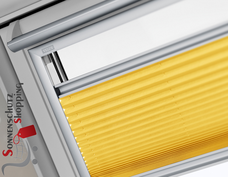 Das Originale Velux Faltstore- Plissee mit Schienen ist ein dezentes Sonnenschutzprodukt am Dachfenster. Der gefaltete Stoff des Plissees läuft gespannt im Schienensystem und ist für jede Tageszeit einsetzbar.